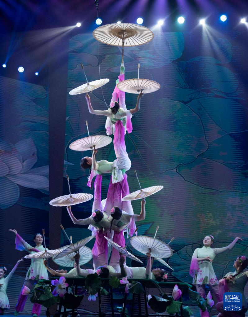 10月25日,在北京二七剧场举行的“艺苑撷英——2025年全国优秀青年艺术人才展演”上,德州市杂技团演员表演杂技《荷塘月色——蹬伞》。新华社记者 才扬 摄