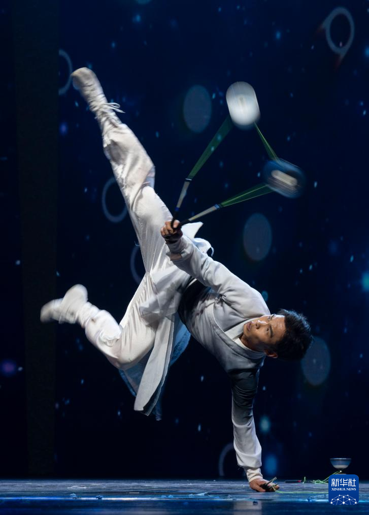 10月25日,在北京二七剧场举行的“艺苑撷英——2025年全国优秀青年艺术人才展演”上,中国铁路文工团有限公司曲艺杂技团演员表演杂技《奕中乾坤·扯铃》。新华社记者 才扬 摄