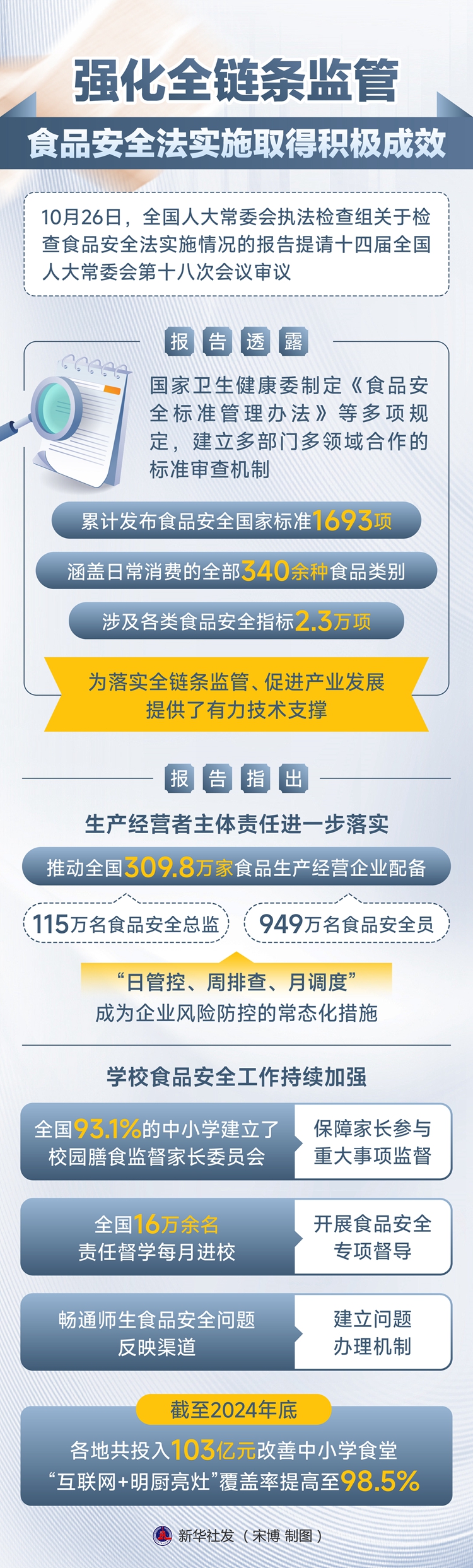 10月26日,全国人大常委会执法检查组关于检查食品安全法实施情况的报告提请十四届全国人大常委会第十八次会议审议。报告指出,食品安全法实施取得了积极成效,我国的食品安全形势持续稳中向好,同时仍面临一些问题和挑战,要加强和改进食品安全监管工作,全面提升食品全链条质量安全保障水平。