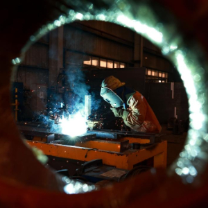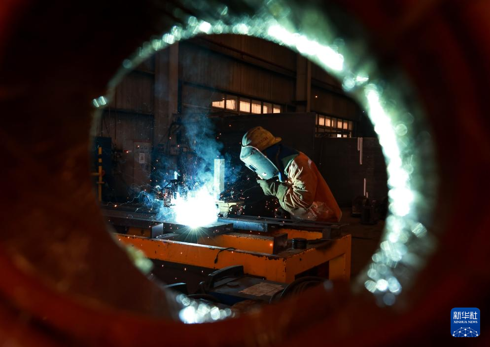 10月27日,中铁科工集团轨道交通装备有限公司技术工人对盾构机盾体配件进行电焊作业。新华社发(赵军摄)