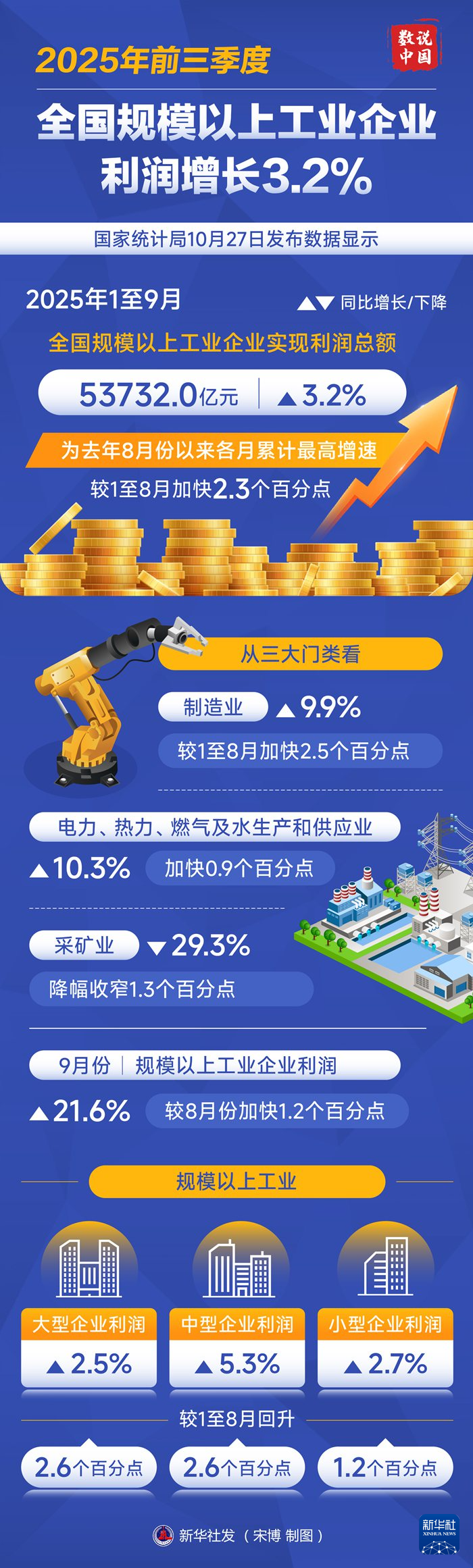 新华社北京10月27日电(记者王雨萧)国家统计局27日发布数据显示,1至9月,全国规模以上工业企业实现利润总额53732.0亿元,同比增长3.2%,增速继续回升。