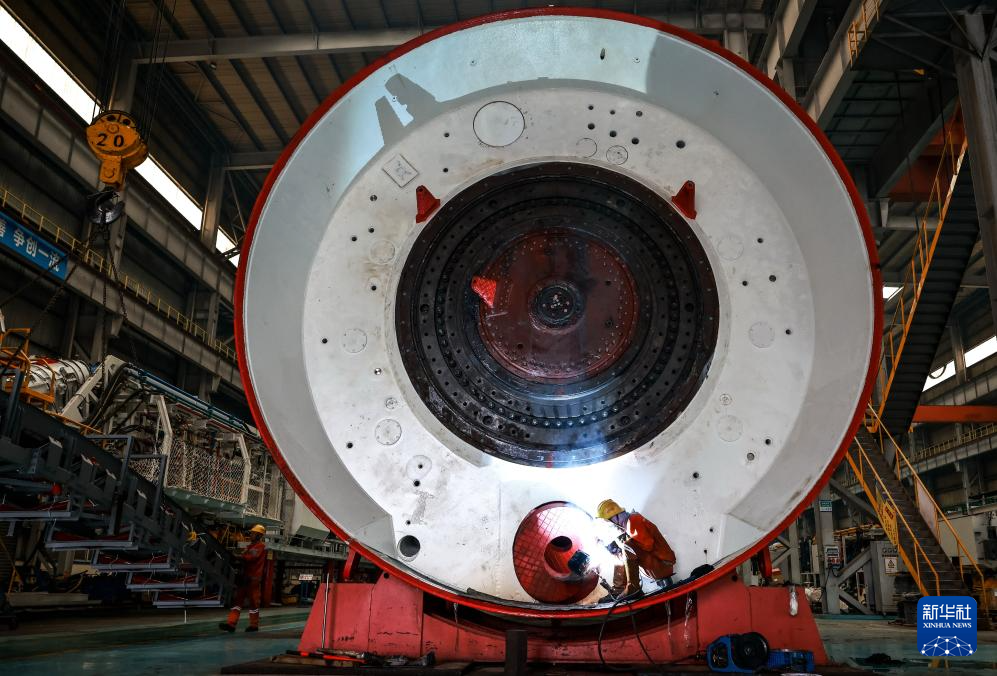 10月27日,中铁科工集团轨道交通装备有限公司技术工人对盾构机盾体进行电焊作业。新华社发(赵军摄)