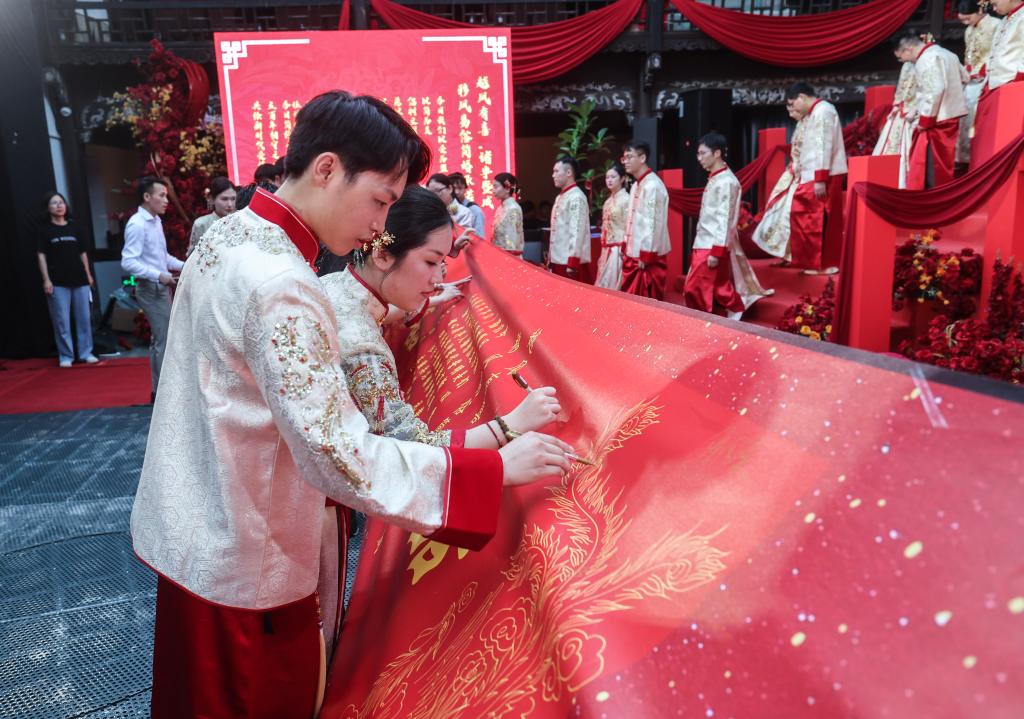 参加集体婚礼仪式的新人们签订移风易俗简婚承诺。新华社记者 徐昱 摄