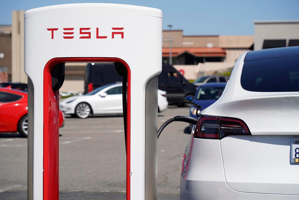 这是2024年4月2日在美国加利福尼亚州圣布鲁诺一处停车场拍摄的特斯拉汽车。新华社发(李建国摄)