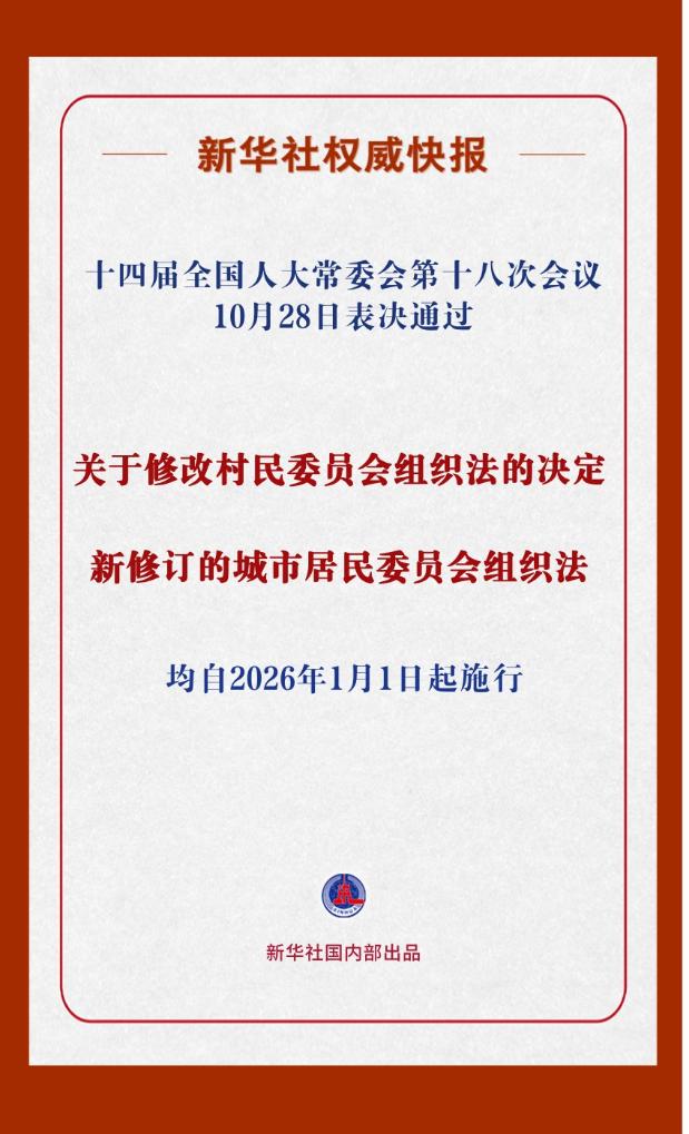 10月28日,十四届全国人大常委会第十八次会议分别表决通过关于修改村民委员会组织法的决定和新修订的城市居民委员会组织法,均自2026年1月1日起施行。