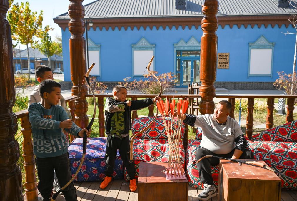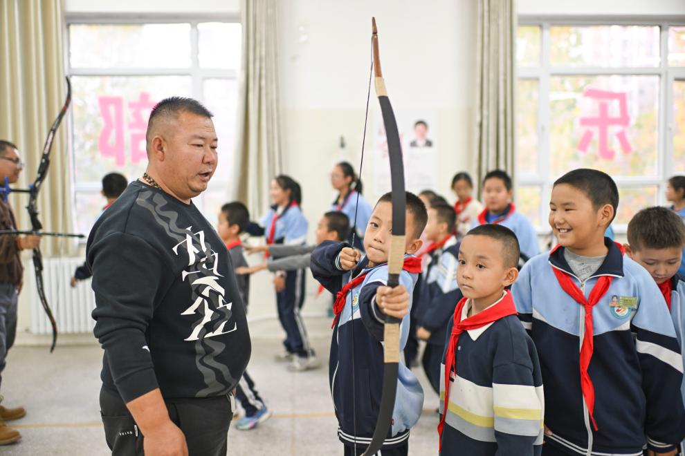 在新疆伊宁市第二十五小学,吴俊亮(左一)指导射箭社团学生练习传统弓(10月23日摄)。新华社记者 胡虎虎 摄