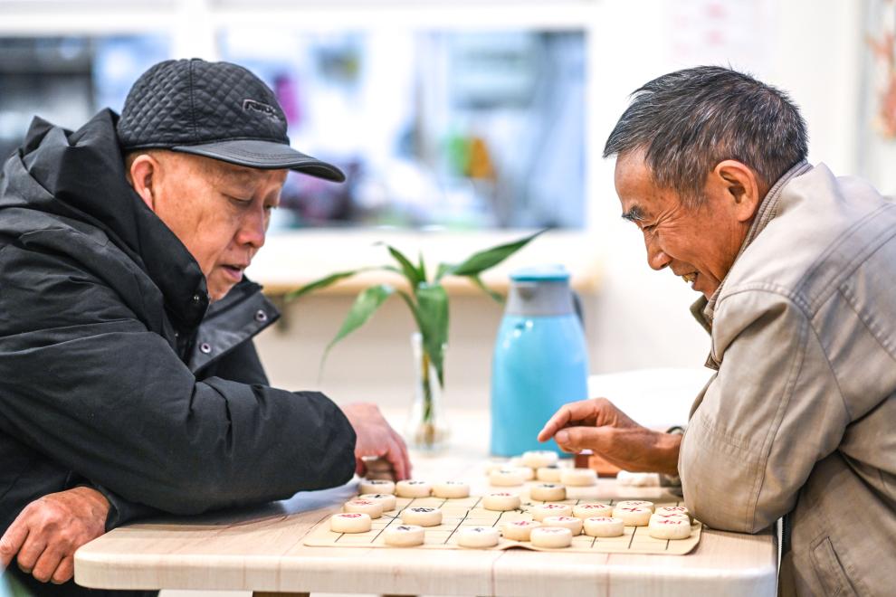 两位老人在贵阳市南明区红岩东郡社区诚善助老公益互助服务点下棋(10月24日摄)。