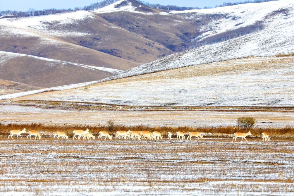 深秋,在内蒙古兴安盟科尔沁右翼前旗满族屯满族乡乌兰敖都嘎查的山地草场上,一大群黄羊在阳光下悠闲漫步,它们已在这里“安家”近两年。