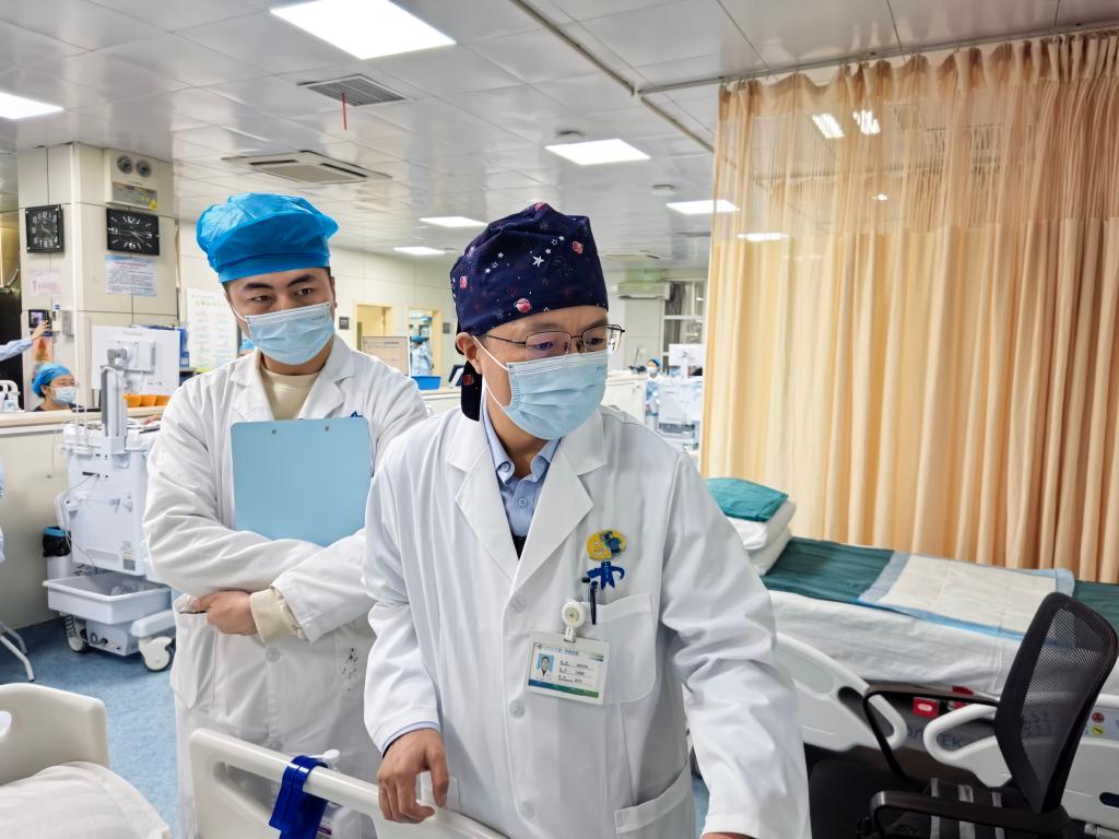 西安交通大学第一附属医院神经内科副主任医师刘福德(右)查看术后患者情况。新华社发