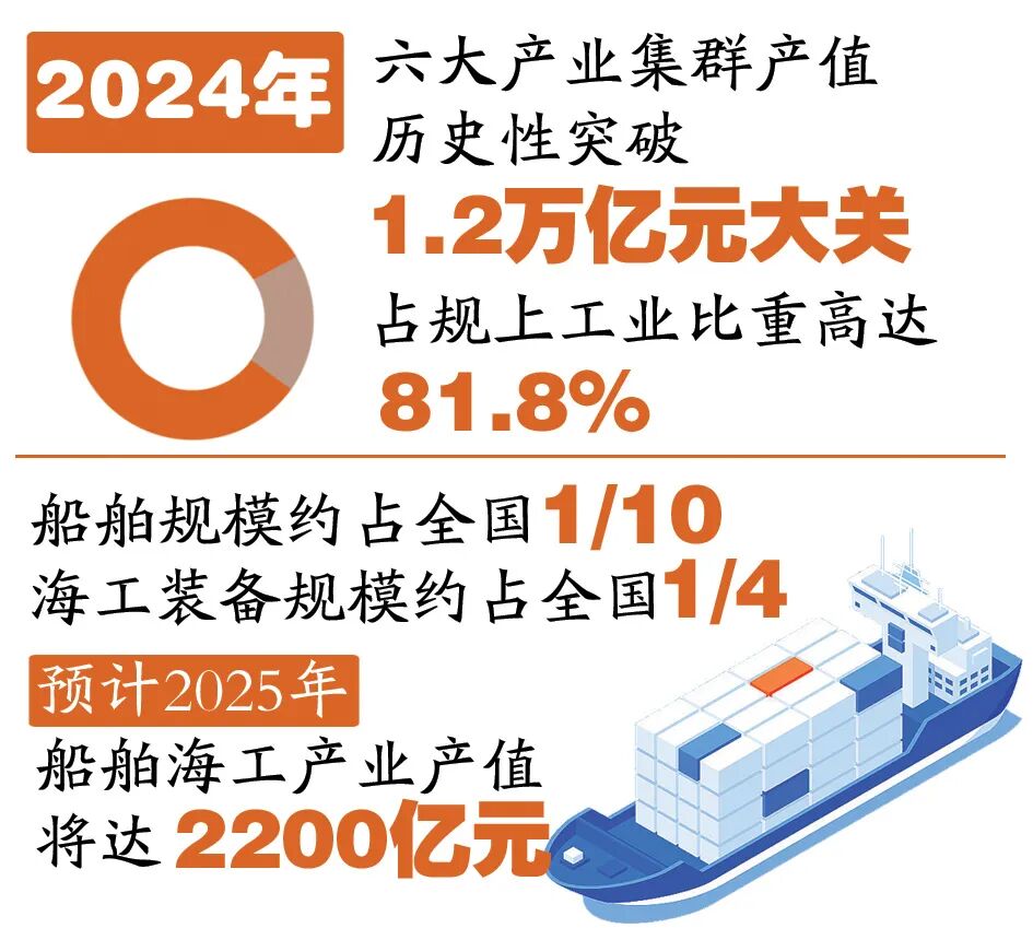 从海上油气平台到深海养殖工船,从海上风电安装船到海底电缆,南通的海洋装备产业版图不断拓展。这里诞生了“天鲲号”“希望六号”、极地探险邮轮等大国重器,船舶规模约占全国1/10,海工装备规模约占全国1/4。预计2025年,船舶海工产业产值将达2200亿元。