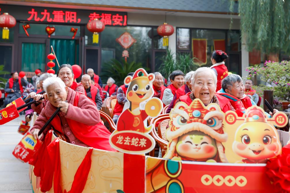 10月28日,在河南省武陟县木城街道木城养老院,老人们参加 “重阳节趣味划船”活动。新华社发(王琳锋 摄)