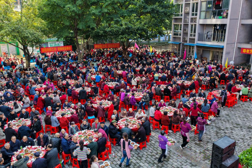 10月28日,重庆市九龙坡区华岩镇石龙社区开展“九九重阳节 浓浓百家情”主题活动,老人们在“长寿宴”活动现场用餐(无人机照片)。新华社记者 黄伟 摄