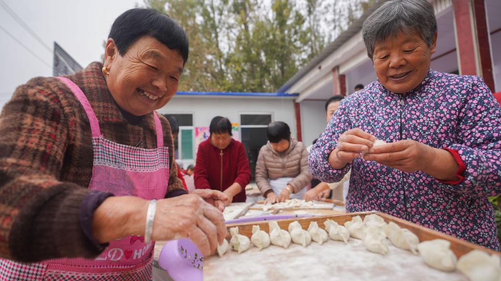 10月28日,山东省邹平市台子镇城关村片区的老人聚在一起包水饺,喜迎重阳节。新华社发(董乃德 摄)