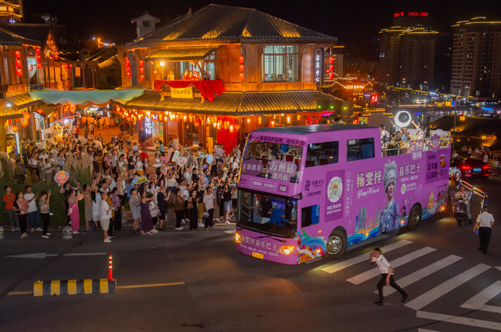 2025年9月13日,网红流动直播巴士开进重庆万州天生城文旅街区,通过网络展现万州城市活力。(冉孟军 摄)