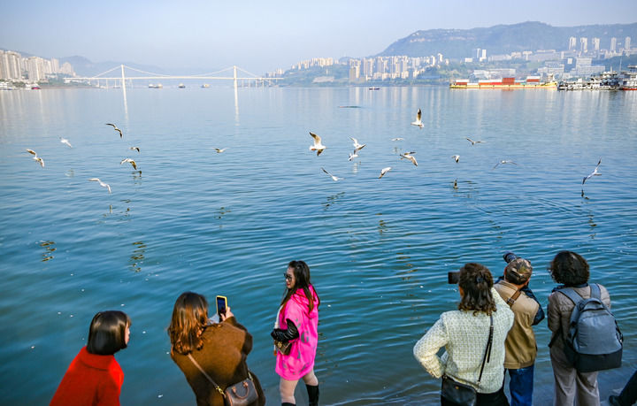 2024年11月29日,市民和游客在重庆万州十七码头观赏红嘴鸥。(付作侨 摄)