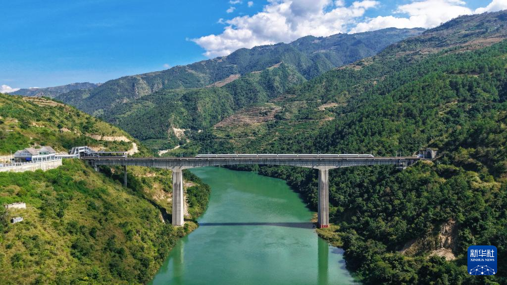 10月30日,一列动车组列车经过小湾东站(无人机照片)。