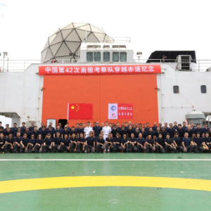 中国第42次南极考察队在“雪龙”号上举行了穿越赤道纪念活动。队员们排列成“42”字样的队形合影留念,以简单而热烈的方式告别北半球,继续向南极挺进。