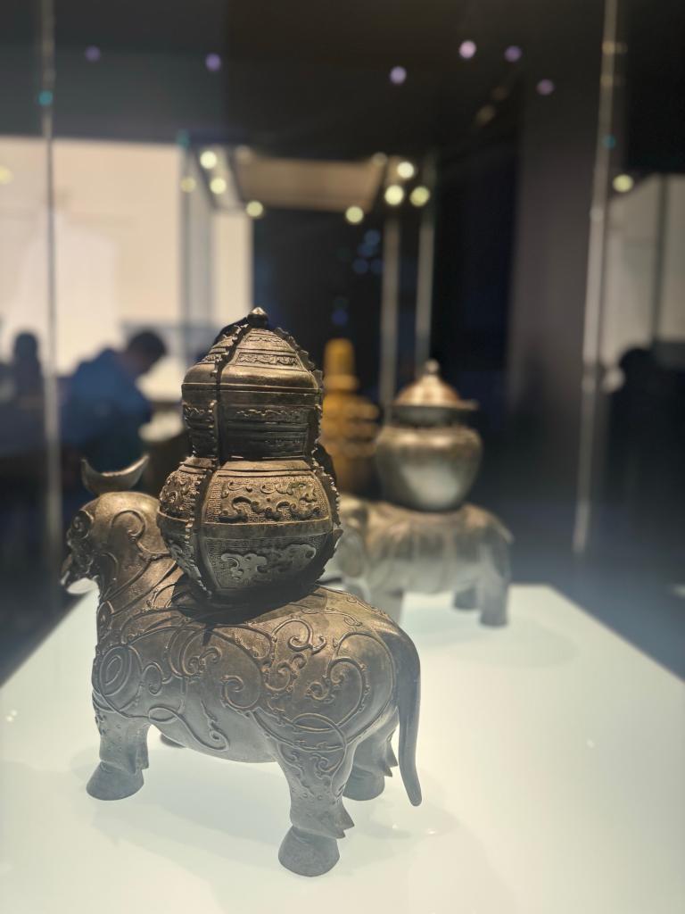 记者看到,整个展览序厅被设计成北宋时期大晟钟的形状,展厅中回荡着优雅空灵的钟声,展品包括了河北博物院藏北宋铜牛鼎、柏林民族学博物馆藏明宣德铜鎏金孔雀明王像、大都会艺术博物馆藏清代鎏金仿古铜“姑洗”钟、故宫博物院藏清代铜牺尊等。