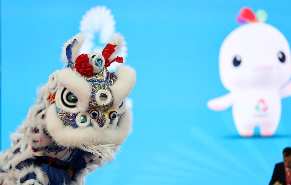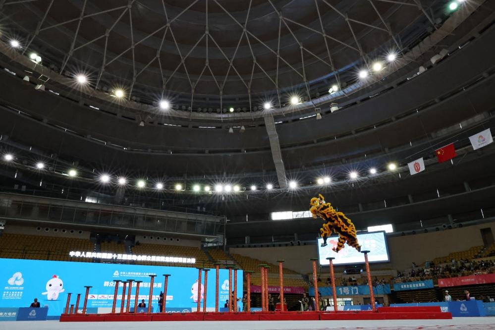 11月11日,湖南队在第十五届全国运动会群众展演舞龙舞狮南狮自选项目决赛中。新华社记者 王鹏 摄