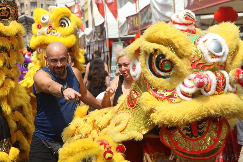 2024年9月14日,民众在巴西圣保罗举办的“欢聚中秋”活动上观看舞狮表演。新华社发(拉赫尔·帕特拉索 摄)