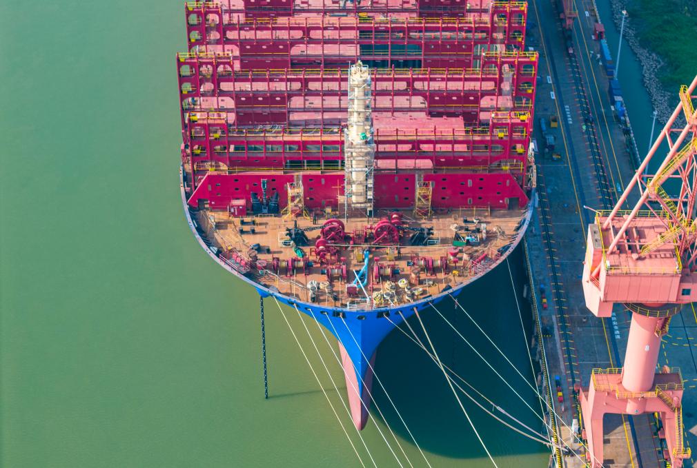 11月13日,在江苏省扬州市江都区的扬州中远海运重工有限公司生产厂区,工人抓紧建设大型船舶(无人机照片)。新华社发(任飞摄)