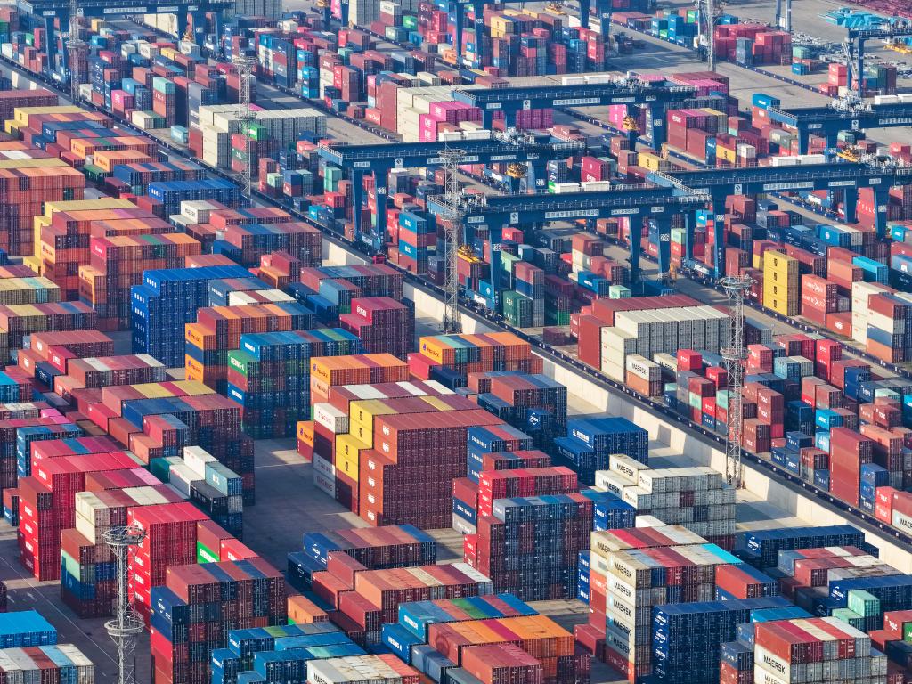 11月14日,轮船停泊在河北省唐山港京唐港区集装箱码头作业(无人机照片)新华社发(刘满仓摄)