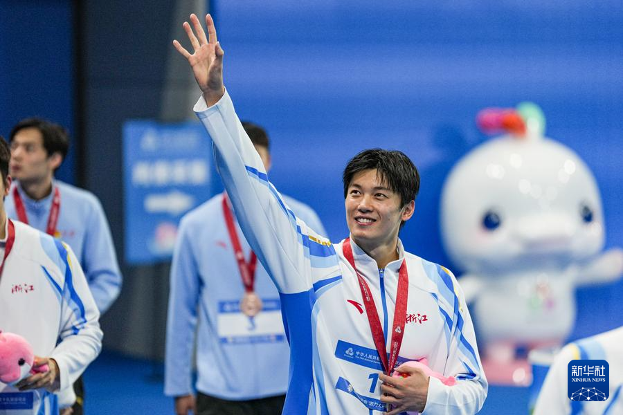 2025年11月10日,冠军浙江队选手汪顺在第十五届全国运动会游泳项目男子4X100米自由泳接力颁奖仪式后向观众致意。新华社记者 丁增尼达 摄