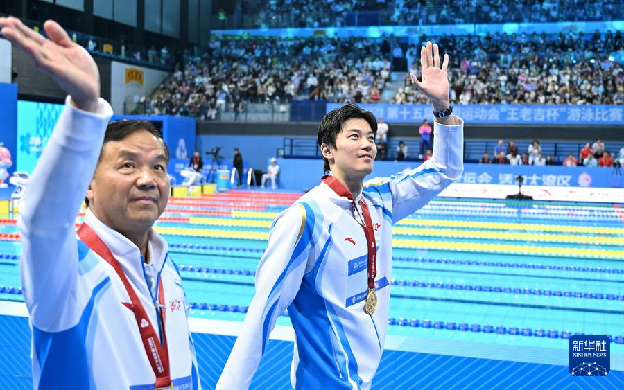 2025年11月14日,汪顺(右)和教练在第十五届全国运动会游泳男子200米个人混合泳颁奖仪式后向观众致意。新华社记者 陈益宸 摄