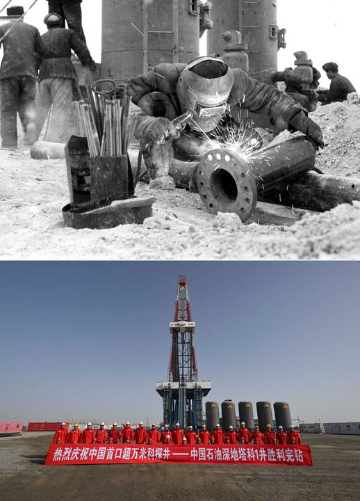 拼版照片:上图为1959年,新疆克拉玛依油田工人在建设九号集油区(新华社记者 武纯展 摄);下图为2025年2月20日,中国石油塔里木油田深地塔科1井现场工作人员庆祝完钻。(新华社记者 胡虎虎 摄)