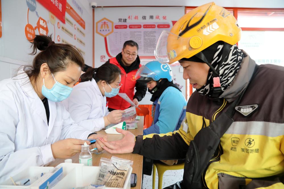 2025年3月5日,志愿者在山东省枣庄市市中区一工会驿站为外卖员免费测量血糖。新华社发