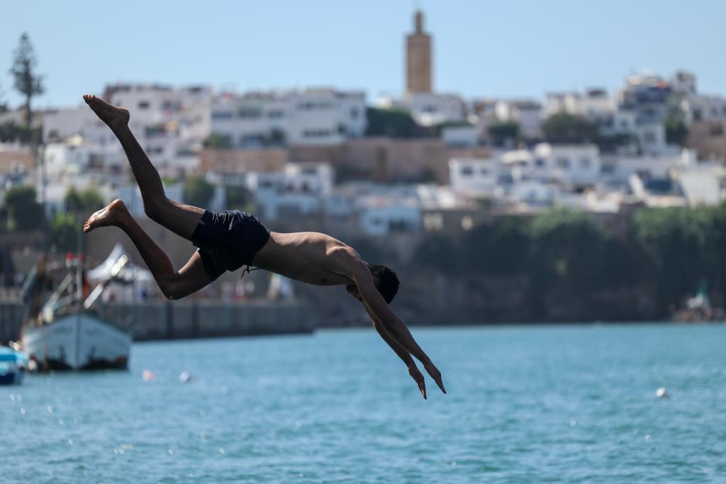 7月30日,在摩洛哥首都拉巴特,一名男子跳向布赖格赖格河纳凉。新华社记者霍晶摄