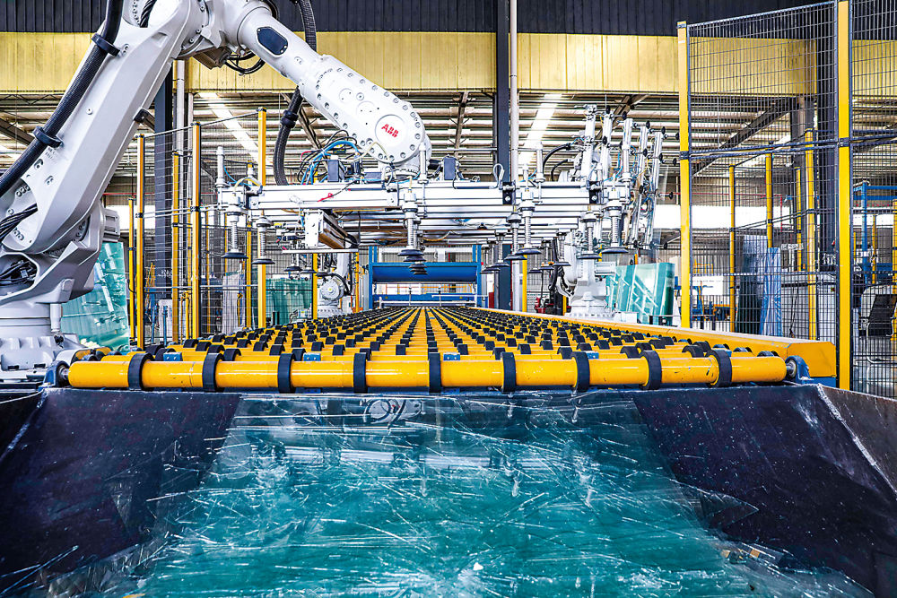 在遂川县恒鑫玻璃有限公司的生产车间,机器抓手在抓取流水线生产的浮法玻璃。