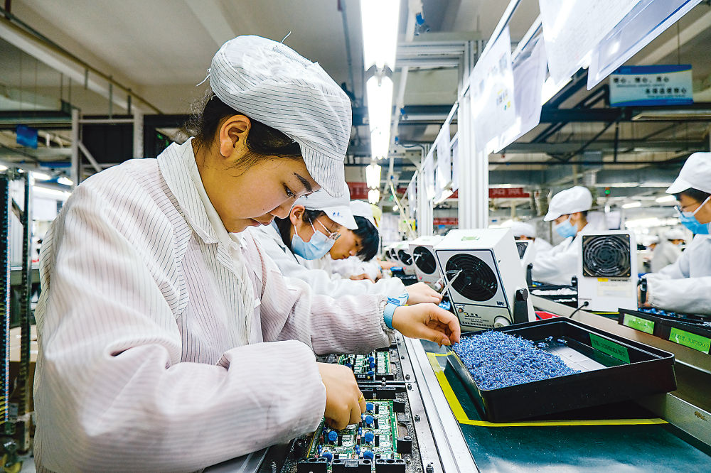 在江西吉安奥海科技有限公司车间内,工人正在拼装电子元器件的插件。