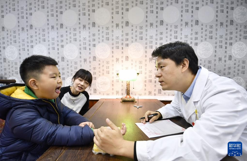 11月13日,同仁堂中医馆中医专家郝鹏(右)为小患者诊病。