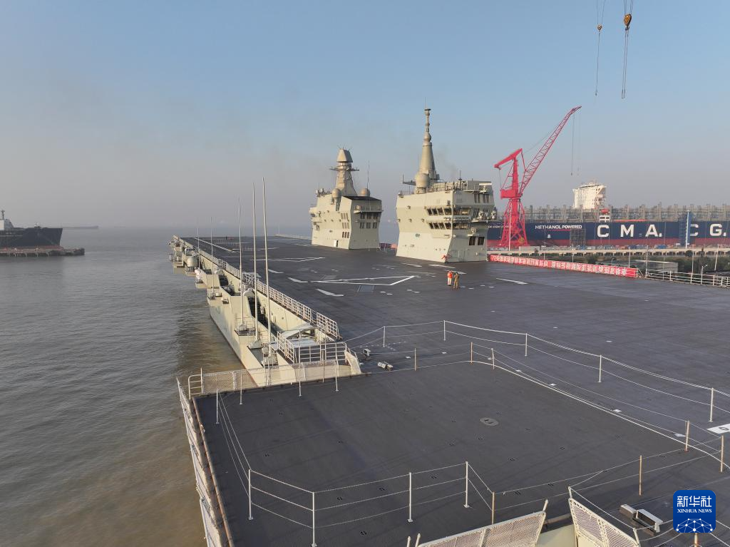 11月14日9时许,我国076两栖攻击舰首舰四川舰从上海沪东中华造船厂码头解缆启航,赴相关海域开展首次航行试验任务。新华社发(张良 摄)