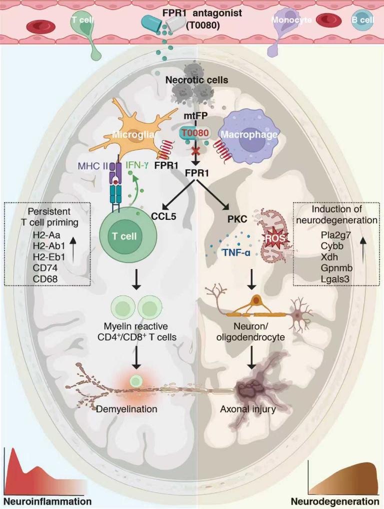 这一新发现进一步完善了中枢神经系统炎症与退行机制的理论体系,并创造出全新的FPR1拮抗剂T0080作为治疗多发性硬化的候选药物,对阿尔茨海默病、帕金森病、脑卒中等多种具有共同病理生理机制的疾病具有潜在的治疗意义。