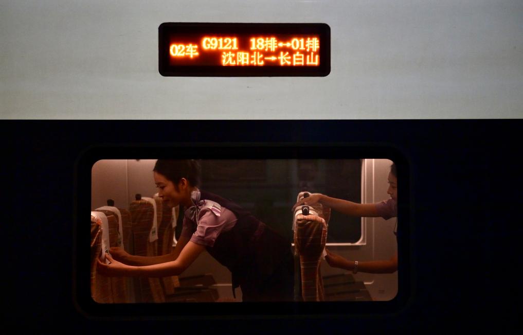 9月4日,沈佳高铁沈白段开始模拟载客试运行,图为乘务员在列车上工作。沈白高铁作为中国东北高铁网重要组成部分,该线路对畅通区域经济循环、促进沿线旅游资源开发等具有重要作用。新华社记者 吴青昊 摄