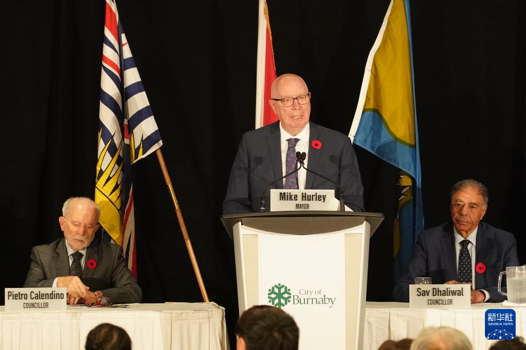 11月15日,在加拿大伯纳比市,伯纳比市市长赫尔利代表市政府宣读声明。新华社发(万斌摄)