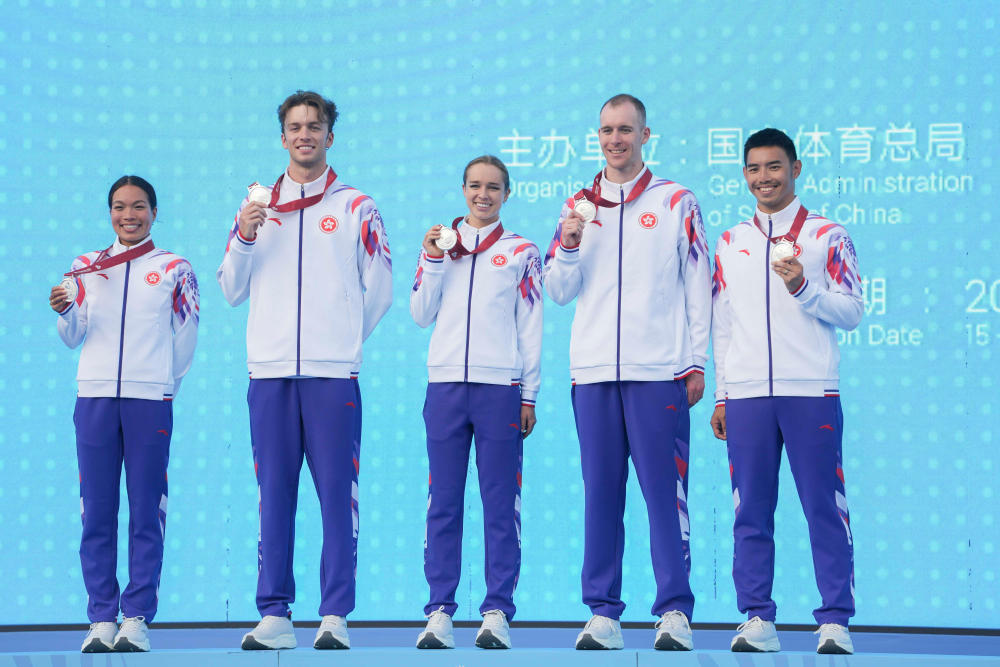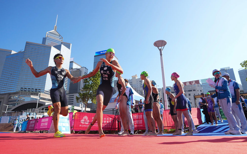 11月16日,在香港举行的第十五届全国运动会铁人三项混合接力决赛中,山东队获得冠军,香港队获得亚军,中国公安体育协会队获得季军。