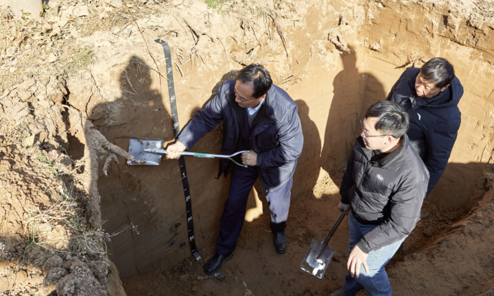 刘彦随(左一)在挖土壤剖面进行工程技术分析。(资料图片)