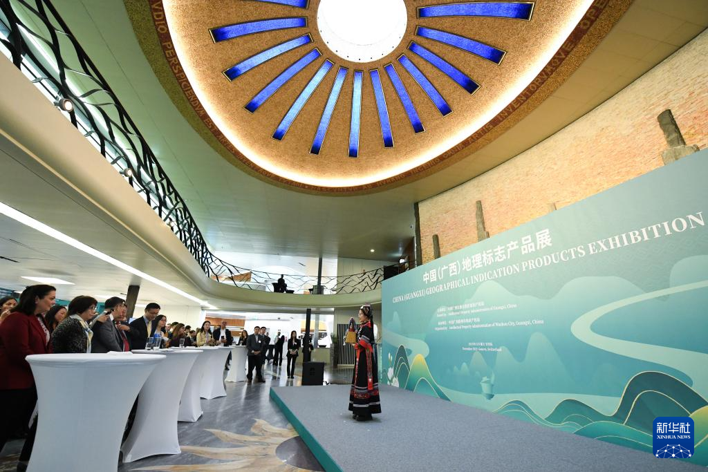 11月17日,在瑞士日内瓦世界知识产权组织总部,人们参观“中国(广西)地理标志产品展”。新华社记者 连漪 摄