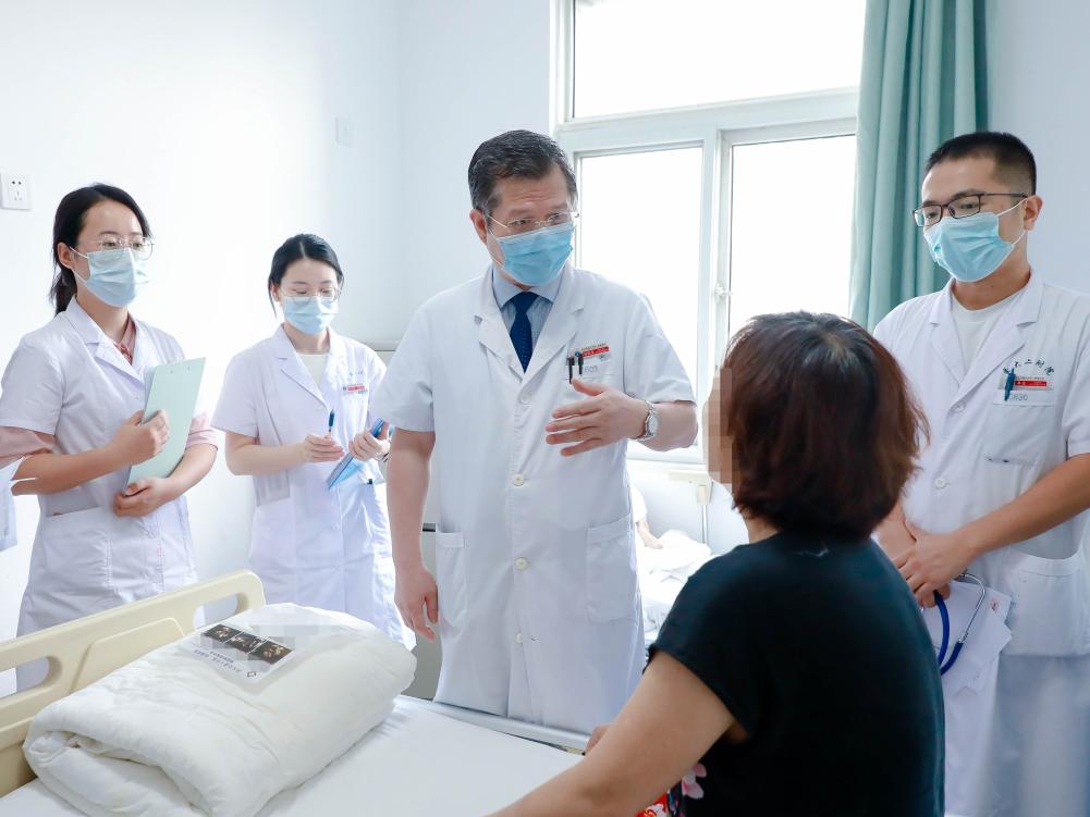 西安交通大学第二附属医院呼吸与危重症医学科主任医师杨拴盈(左三)为患者查房。新华社发