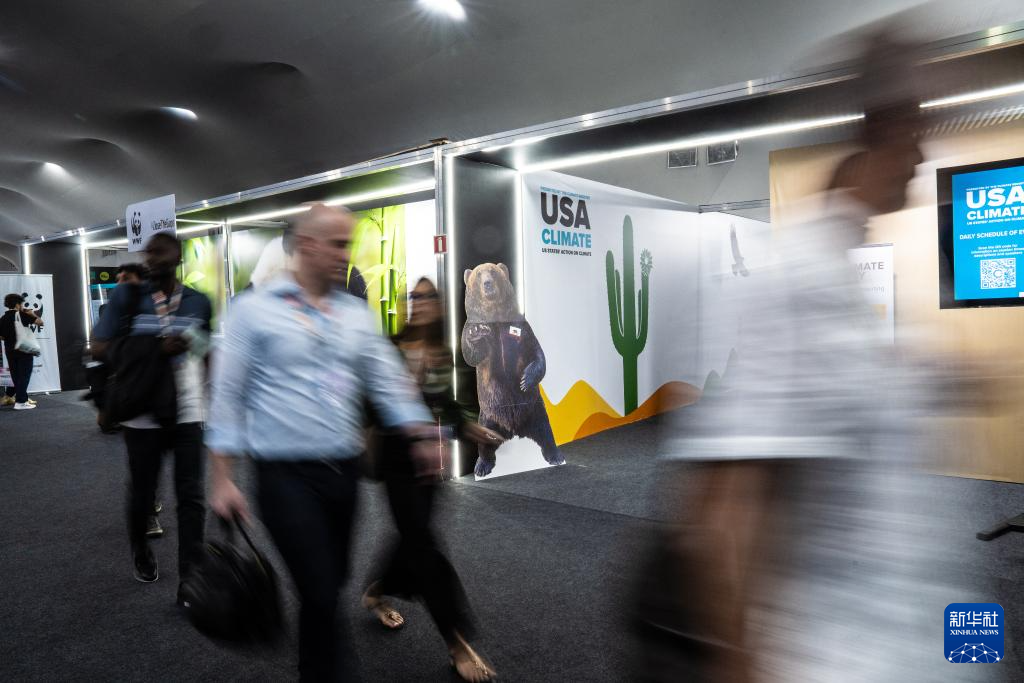 11月17日,在巴西贝伦举行的《联合国气候变化框架公约》第三十次缔约方大会(COP30)上,人们走过“美国馆”。 新华社记者 王天聪 摄