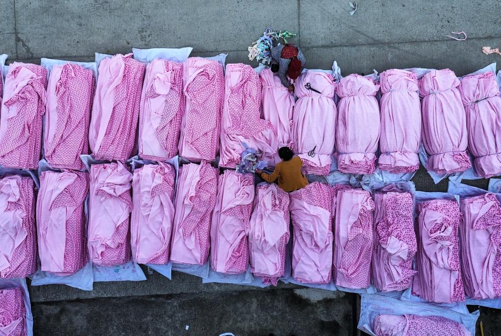 姚家坡村村民在整理布料(无人机照片)。新华社记者 朱峥 摄