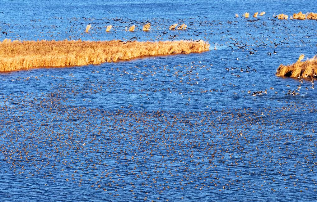 “衡水湖充足的食物资源是基础保障,丰富的水生生物吸引候鸟在此集结。”张余广告诉记者,在长途迁徙中,候鸟抱团飞行,既能借助气流节省体力,又能共同抵御天敌。万千鸟儿同步升空,便造就了规模浩大的“鸟浪”。