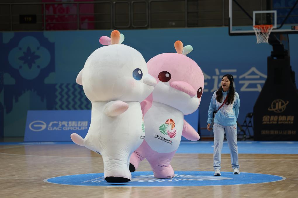 11月16日,在澳门举行的第十五届全国运动会篮球项目男子18岁以下组1/4决赛中,浙江队103:90战胜四川队,吉祥物在比赛间隙表演。新华社记者 孙凡越 摄