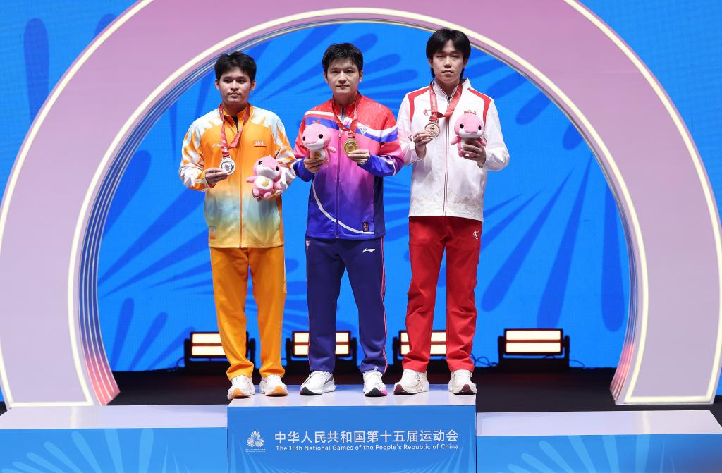 11月16日,冠军上海队选手樊振东(中)、亚军海南队选手林诗栋(左)、季军北京队选手王楚钦在颁奖仪式上。新华社记者 陈斌 摄