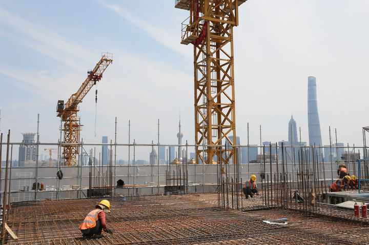 2025年7月15日,建筑工人在上海黄浦区508-514街坊地块旧城区改造一期项目一幢楼房屋顶进行钢筋捆扎作业。新华社记者 方喆 摄