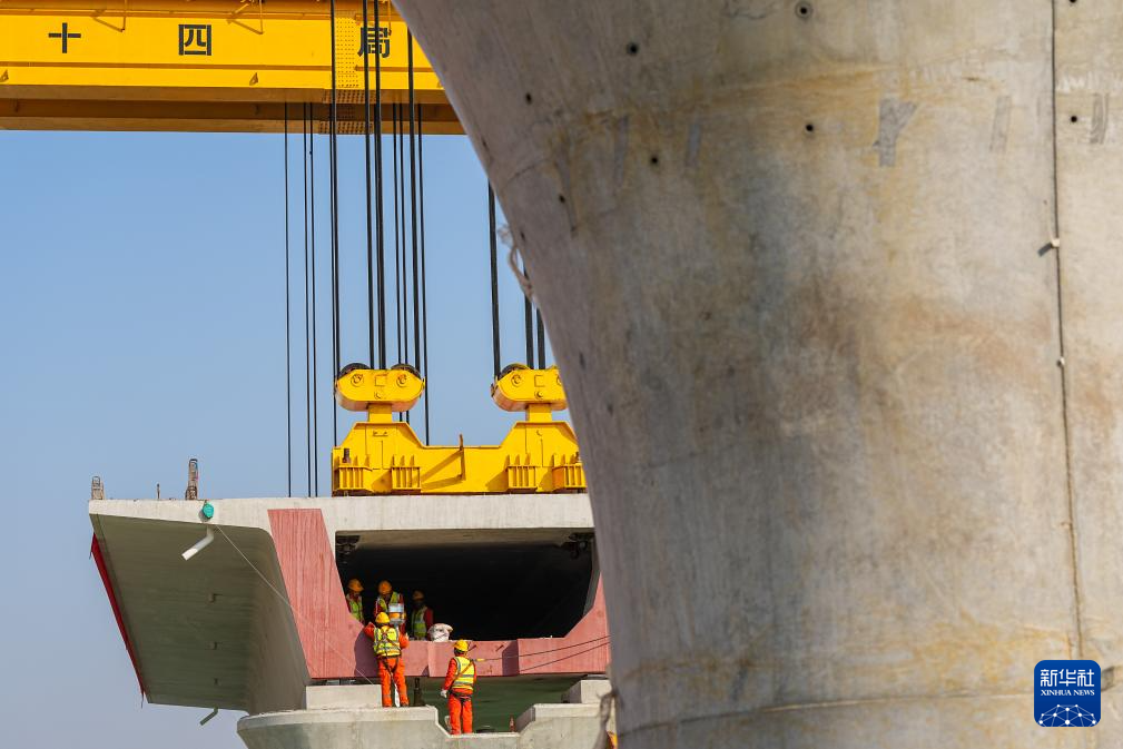 11月21日拍摄的山东临沂潍宿高速铁路九标段跨岚曹高速特大桥首榀箱梁架设施工现场(无人机照片)。