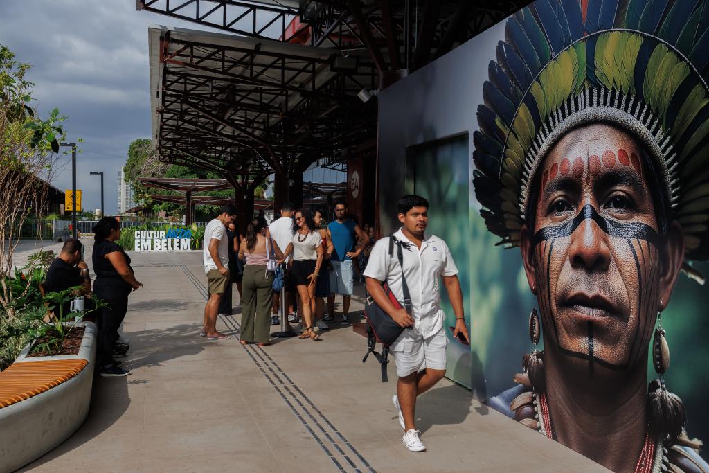 2025年11月13日,在巴西贝伦,人们经过一处印有当地原住民形象的海报。新华社发(克劳迪娅·马尔提尼摄)